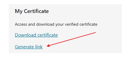 Dazu gehst du im MCT Portal auf deinen Profilnamen oben rechts, dann auf My Profile und dort im Bereich My Certificate auf Generate Link. Danach kurz warten und anschließend auf Copy certificate link klicken. Erst dann befindet sich der Link tatsächlich in der Zwischenablage und kann weitergegeben werden.